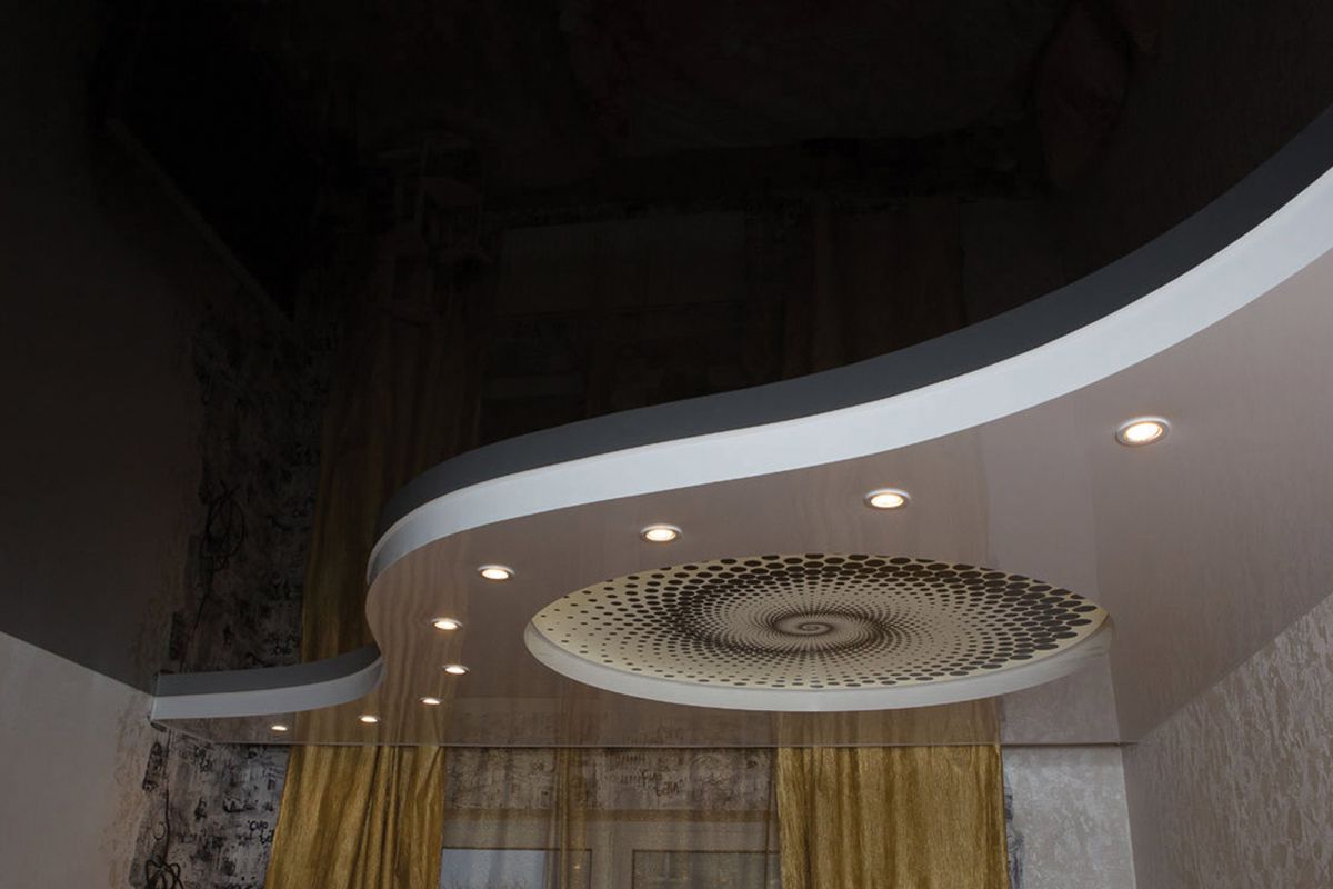 Многоуровневый натяжной потолок открывает безграничный простор для творчества. Вы можете выбирать различные формы: волны, спирали, прямые и изогнутые линии, а также комбинировать цвета и фактуры полотен (матовые, глянцевые, сатиновые). Это готовое и гармоничное дизайнерское решение, не требующее дополнительного декора.