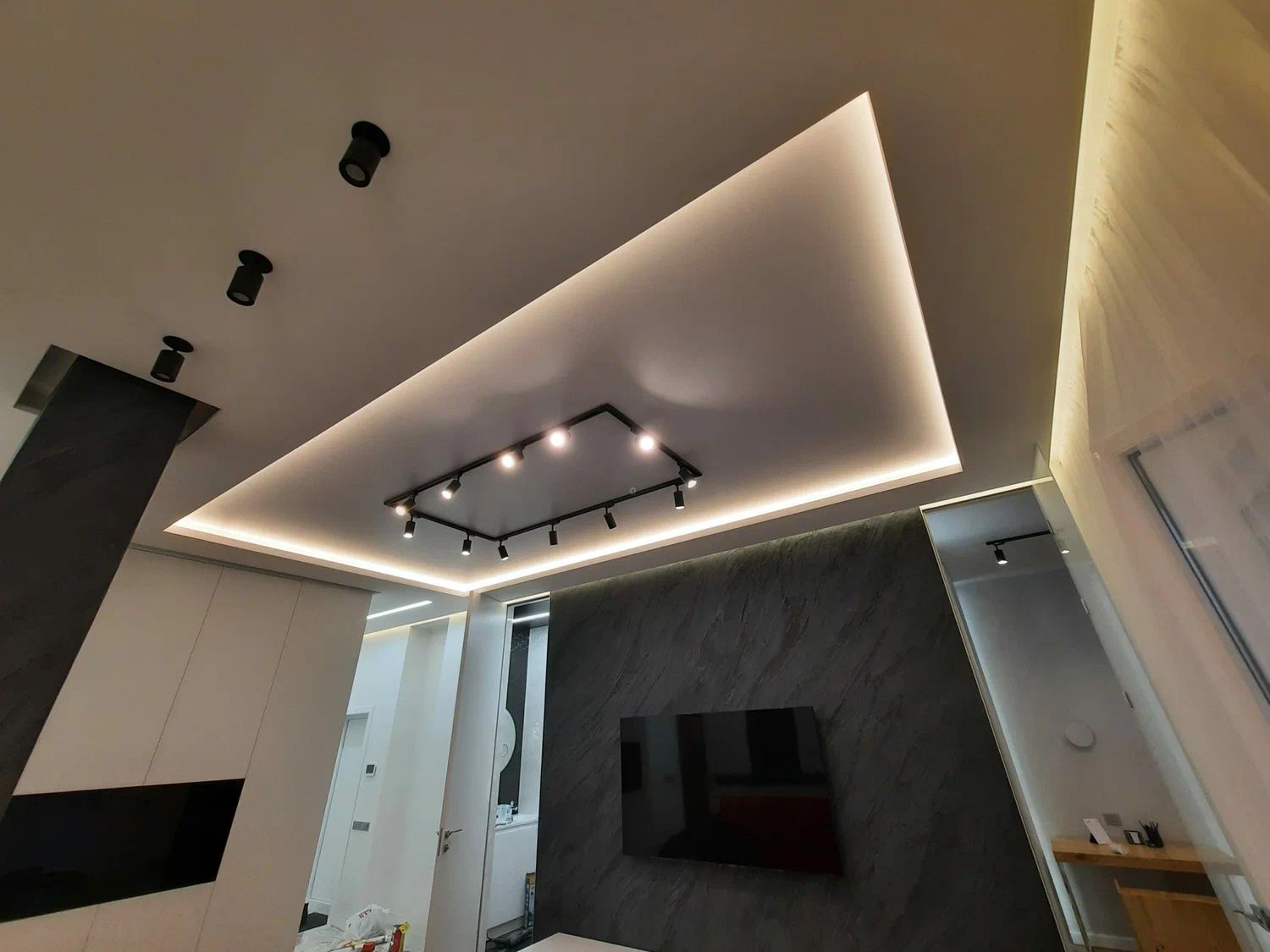 Обратите внимание на двухуровневый натяжной потолок – идеальное дизайнерское решение для современных квартир, офисов и коммерческих помещений. Это не просто осветительная конструкция, а настоящая арт-инсталляция на потолке, которая кардинально меняет восприятие пространства.