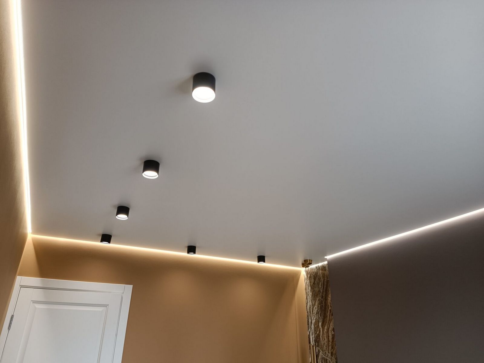 Конечно! Вы можете установить классическую люстру или точечные светильники в центральной части полотна, а парящий контур со светодиодной лентой будет выполнять роль декоративной и дополнительной подсветки. Это создает многоуровневую игру света.